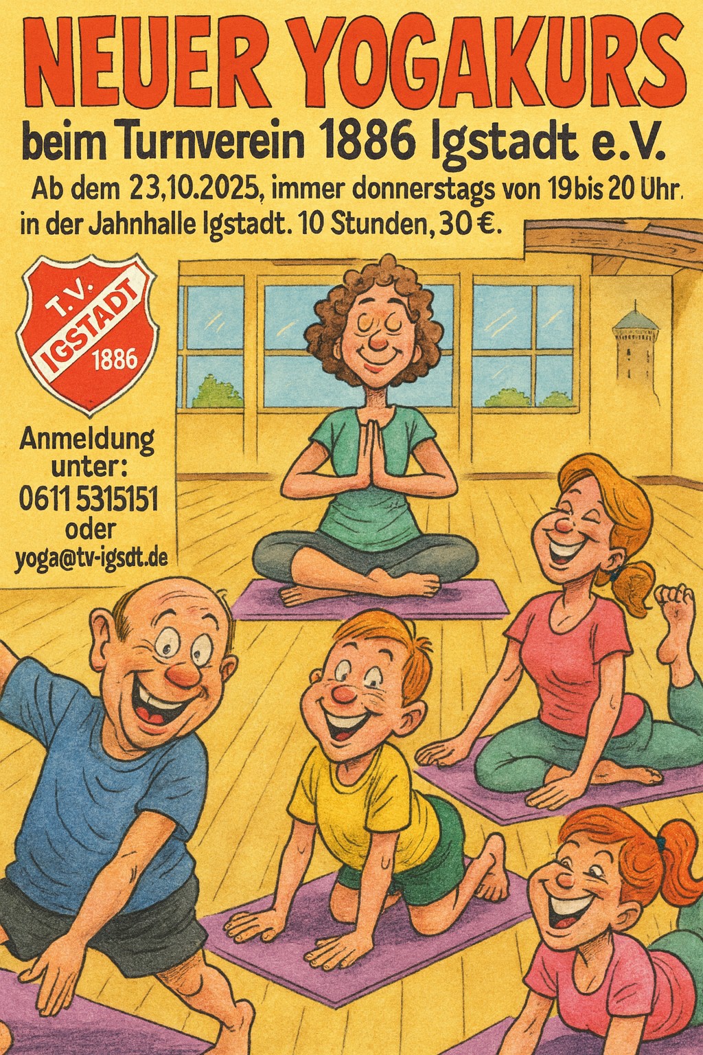 Am 23.10.2025 beginnt beim Turnverein Igstadt ein neuer Yogakurs für Vereinsmitglieder. Der Kurs geht über 10 Stunden und findet immer donnerstags von 19:00 bis 20:00 Uhr in der Jahnhalle in Igstadt statt.