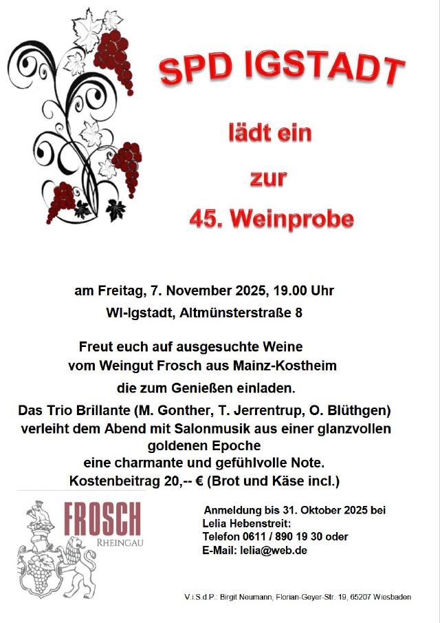 Die SPD Igstadt lädt am Freitag, 7. November 2025, um 19:00 Uhr zur 45. Weinprobe in die Altmünsterstraße 8 ein.
