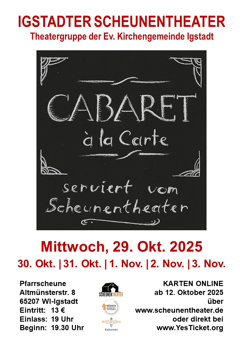 Die Theatergruppe der Ev. Kirchengemeinde Igstadt präsentiert ab dem 29. Oktober 2025 ihr neues Programm „Cabaret à la Carte“. Freuen Sie sich auf einen abwechslungsreichen Abend voller Humor, Musik und Theater in der Pfarrscheune Igstadt.