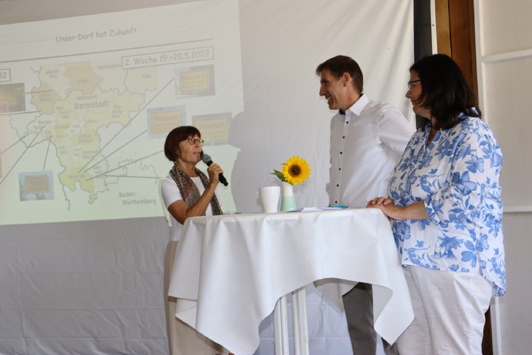 Der Weinstand, der von allen Vereinen im Ort gemeinsam organisiert wird und sich als Treffpunkt aller Altersgruppen etabliert hat. Den zahlreichen kulturellen Angeboten im Pfarrhof und der Pfarrscheune und das Scheunentheater. Von der Qualität der Darbietung konnte sich die Kommission beim kurzen Besuch in der Probe selbst überzeugen. Die Idee des Freitagstreffs am Dorfbrunnen, hat die Kommission verblüfft. Wie einfach ein offenes Angebot zu Treffen und Austausch für alle Bürger im Ort installiert werden kann.