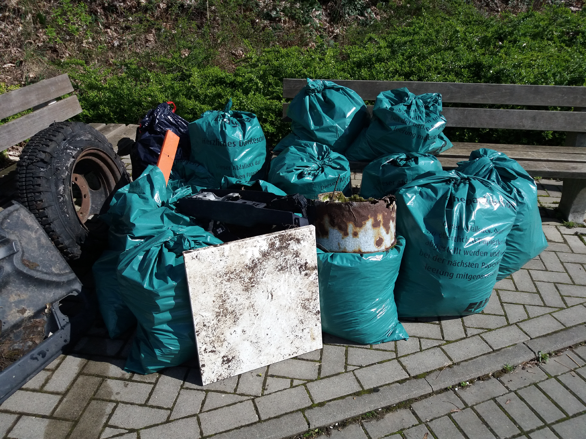 Bei wechselhaftem Aprilwetter konnten viele kuriose Müllartikel gesammelt werden. Darunter die Innenverkleidung einer Autotür, Autoreifen und viele leere Flaschen.