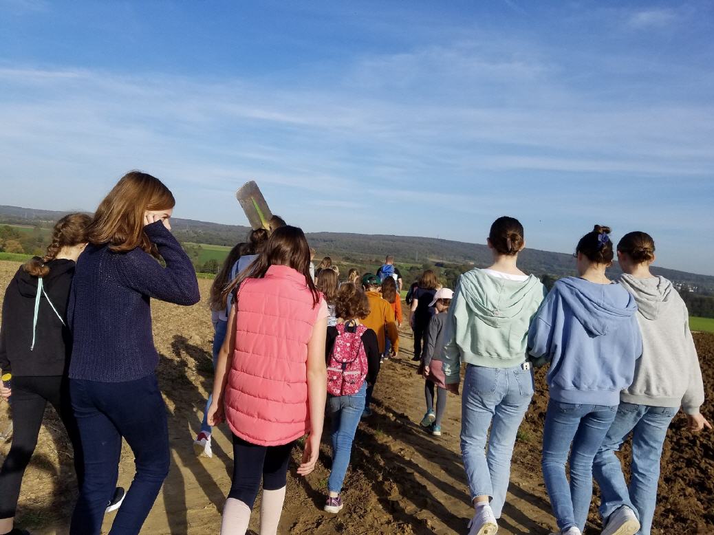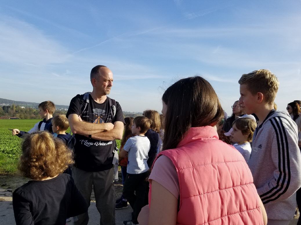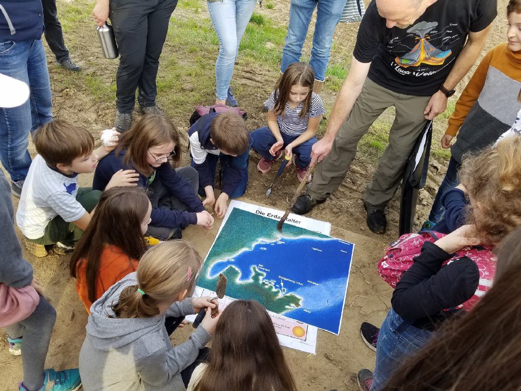 Doch woher weiß man das, wie arbeitet eigentlich ein Geowissenschaftler und wie beschreibt man einen Boden? Mit einer kleinen Feldübung und Experimenten an einem Acker oberhalb des Wickerbachs konnte ein kleiner Einblick in die Werkstatt des Geologen gegeben werden. „Beobachten, Untersuchen, Verstehen – das sind die wichtigsten Schritte, um viele Fragen zu beantworten“, so Michael Weidenfeller. Er holte mehrere Dosen aus seinem Rucksack, die mit Kies, Sand und Ton gefüllt waren. Die Proben wurden von den Kindern untersucht und die Unterschiede beschrieben. Auch eine Dose mit Schluff war dabei. Schluff? Diesen Begriff hatten die meisten Kinder, aber auch die Erwachsenen noch nicht gehört. Er ist feiner als Sand, aber nicht so schmierig wie Ton und fühlt sich mehlig an. Der eiszeitlich entstandene Löss, der für die fruchtbaren Böden rund um Igstadt verantwortlich ist, setzt sich überwiegend aus Schluff zusammen. Was der Schluff besonders gut kann, ist Wasser zu speichern. Um das zu belegen, wurden die Dosen mit den verschiedenen Proben mit Wasser gefüllt. Während das Wasser schnell durch den Kies und Sand hindurchfloss, konnte der Schluff das Wasser wie ein Schwamm aufsaugen. Auch die Bodenfarbe wurde von den Kindern unter Verwendung einer genormten Farbtafel und der Kalkgehalt durch den Einsatz einer schwachen Säure bestimmt.
