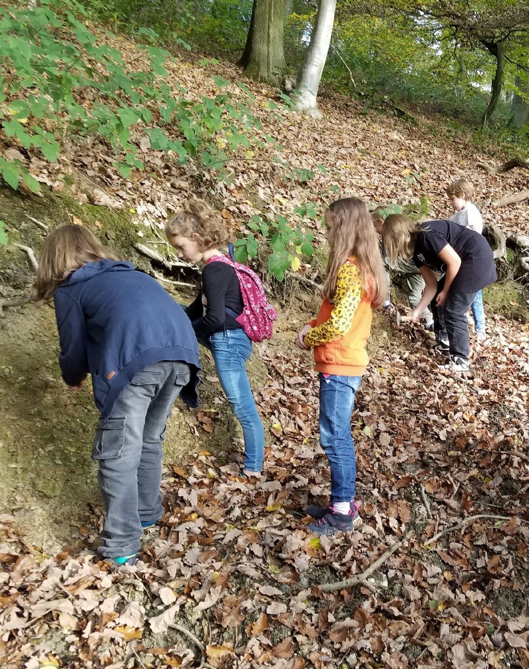 Nach den Experimenten ging es weiter über den Wickerbach und talaufwärts in Richtung Obermühle. „Haben alle gemerkt, dass wir jetzt die ehemalige Kontinent-Kontinent-Grenze überschritten haben?“ Ungläubiges Staunen. Doch nur wenige hundert Meter weiter fand sich eine Stelle im Hang, an der Steine zu sehen waren, die bei der Wanderung bis dahin noch nicht angetroffen wurden. Mit Spaten, Hammer und Kellen, aber auch mit bloßen Händen lösten die jungen Forscherinnen und Forscher die Gesteinsplatten aus der Böschung. Die Stücke wurden mit Wasser aus der Spritzflasche abgespült und anschließend vorgezeigt. „Die Steine sind flach“, „... und glänzen!“ „… und sie sind grau und hart,“ so die Beschreibungen der Kinder. „Das ist ein Phyllit, das älteste Gestein am Taunusrand“, erklärte der Experte. Es entstand, als die beiden Kontinente noch voneinander getrennt waren, also noch lange bevor es Dinosaurier auf der Erde gab.