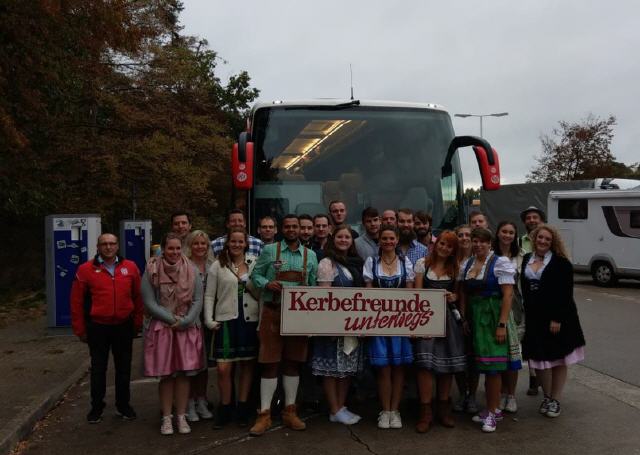 Am Tag der Deutschen Einheit haben sich 25 Knierieme und Vereinsfreunde um 06:30 am Wasserturm getroffen um gemeinsam ins Schwabeland zur Cannstatter Wasen zu fahren. Die Teilnehmer staunten allerdings nicht schlecht, als der Bus des Fußballclubs Mainz 05 vorfuhr. Auch wenn der Bus aus der letzten Saison ist, bat er doch einigen Komfort wie 4er-Sitze mit elektrisch höhenverstellbaren Tischen, mehrere Kühlschränke, Teeküche, WC u.v.m.