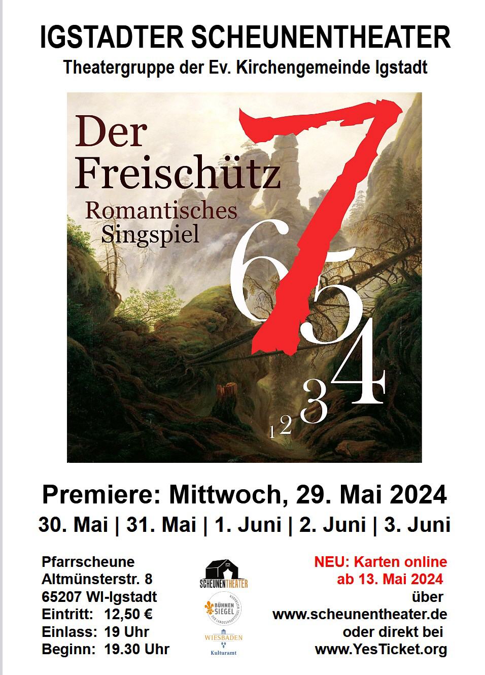 vom 29. Mai bis 3. Juni 2024 hebt sich in der Pfarrscheune der Vorhang zu „Der Freischütz“. Diese Oper von Carl Maria von Weber werden wir mit viel Humor als tragikomisches romantisches Singspiel präsentieren.
