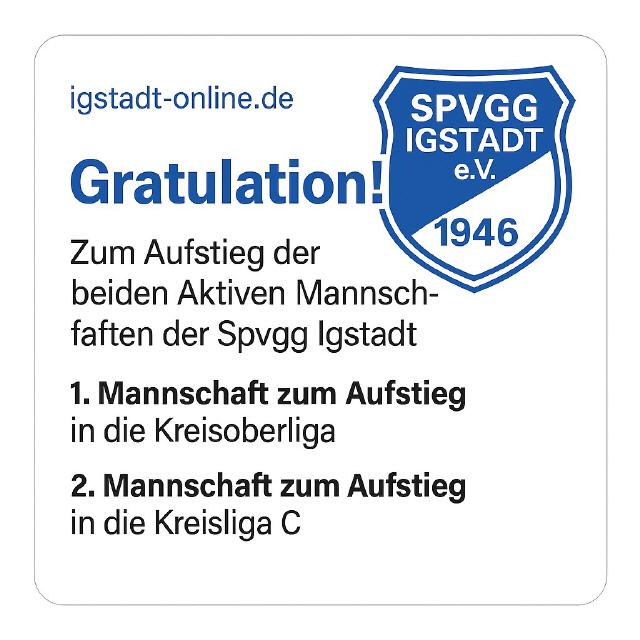 Dank einer günstigen Tabellenkonstellation und starker eigener Leistungen gelingt der SpVgg Igstadt ein historischer Doppelerfolg: Die Erste Mannschaft steigt in die Kreisoberliga auf, die Zweite schafft den Sprung in die Kreisliga C.