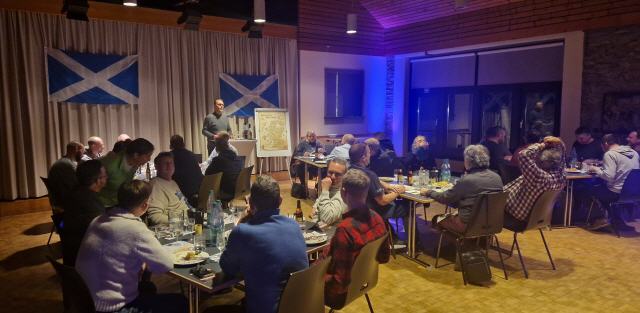 Kulinarisch begleitet wurde die Veranstaltung von einem Drei-Gänge-Menü mit Wildbratwurst, Karotten-Maronen-Suppe, Rehbraten mit Klößen und Rotkohl sowie klassischem Shortbread zum Abschluss. Dank der Unterstützung zahlreicher Helferinnen und Helfer herrschte eine entspannte und stimmungsvolle Atmosphäre.
