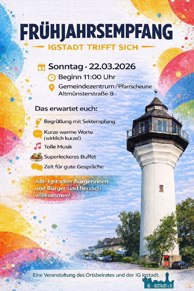 Am Sonntag, 22. März 2026 um 11:00 Uhr heißt es im Gemeindezentrum / Pfarrscheune, Altmünsterstraße 8 wieder: Igstadt trifft sich!