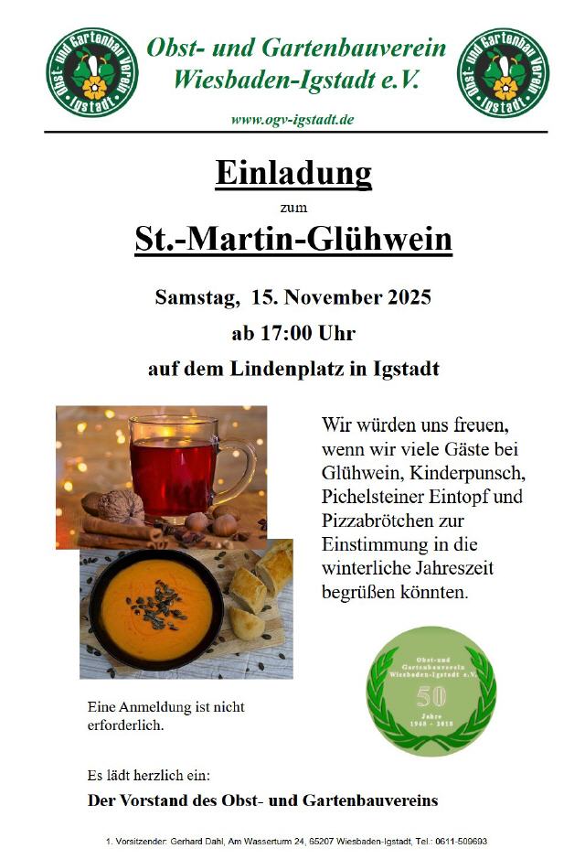 Der Obst- und Gartenbauverein Wiesbaden-Igstadt lädt am Samstag, 15. November 2025, ab 17:00 Uhr herzlich zum St.-Martin-Glühwein auf den Lindenplatz in Igstadt ein.