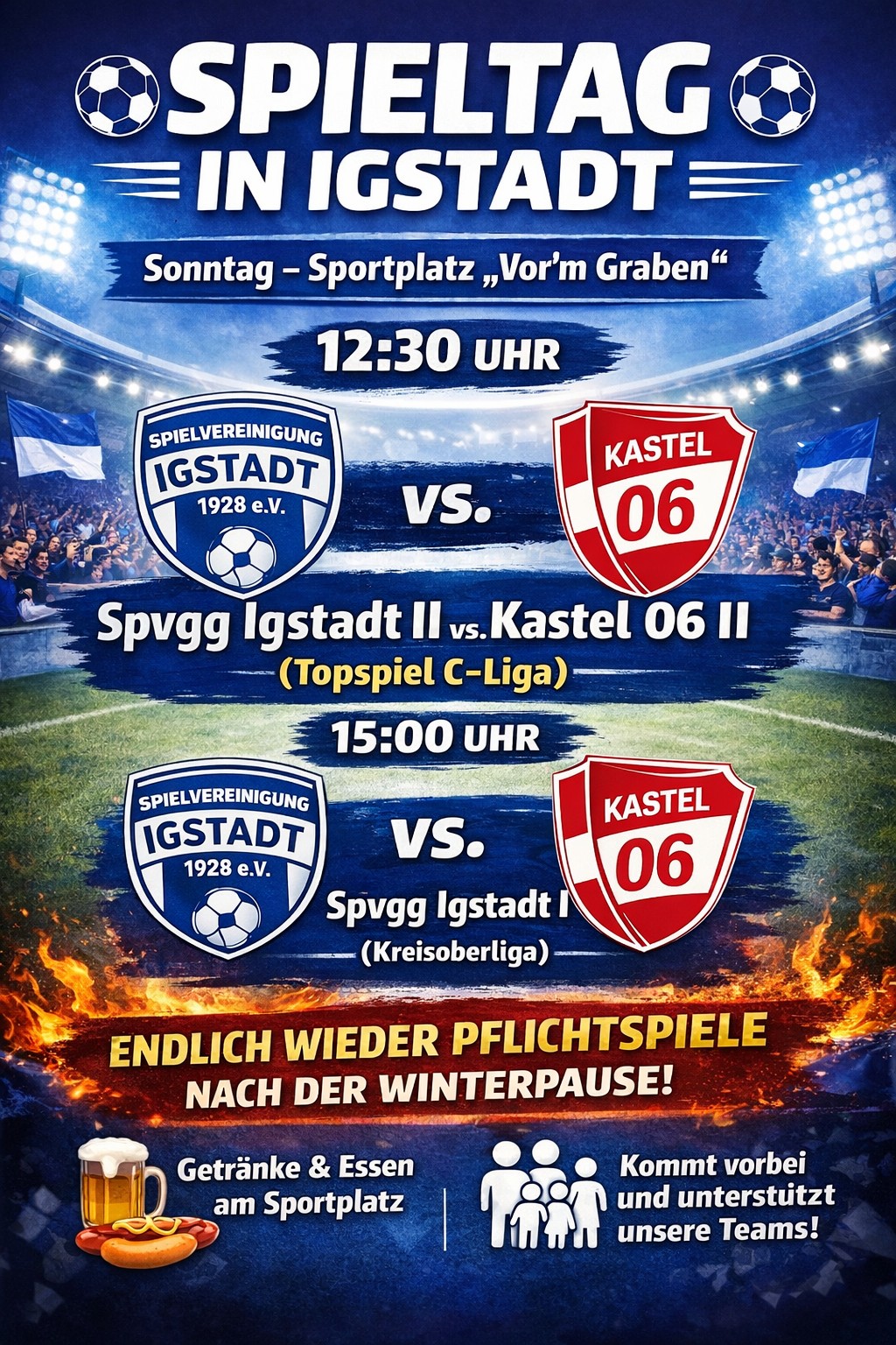 Den Auftakt macht um 12:30 Uhr die 2. Mannschaft im Topspiel der C-Liga gegen Kastel 06 II. Die Igstadter gehen als Tabellenführer in die Restrunde und wollen ihre starke Hinrunde bestätigen.
