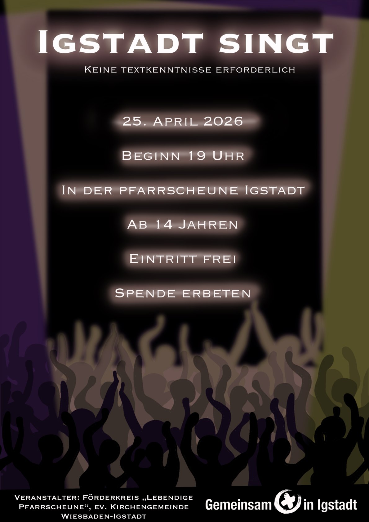 Am Samstag, 25. April 2026, lädt der Förderkreis „Lebendige Pfarrscheune“ der Ev. Kirchengemeinde Igstadt zum gemeinsamen Singen in die Pfarrscheune ein. Ab 19 Uhr erwartet die Besucher ein bunter Mix aus Evergreens und aktuellen Hits – die Liedtexte werden auf eine Leinwand projiziert, sodass alle mitsingen können. Auch Liedwünsche sind ausdrücklich willkommen.