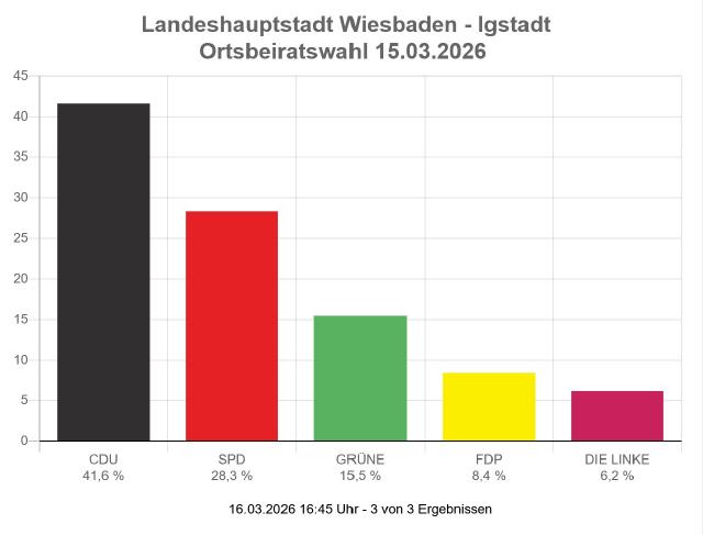 Bei einer starken Wahlbeteiligung von 67,5 % zeigt sich in Igstadt ein stabiles, aber durchaus spannendes Ergebnis. Die CDU bleibt mit 41,6 % und 3 Sitzen klar stärkste Kraft im Ortsbeirat. Dahinter folgt die SPD mit 28,3 % und 2 Sitzen, während die GRÜNEN (15,5 %) und die FDP (8,4 %) jeweils einen Sitz erhalten.