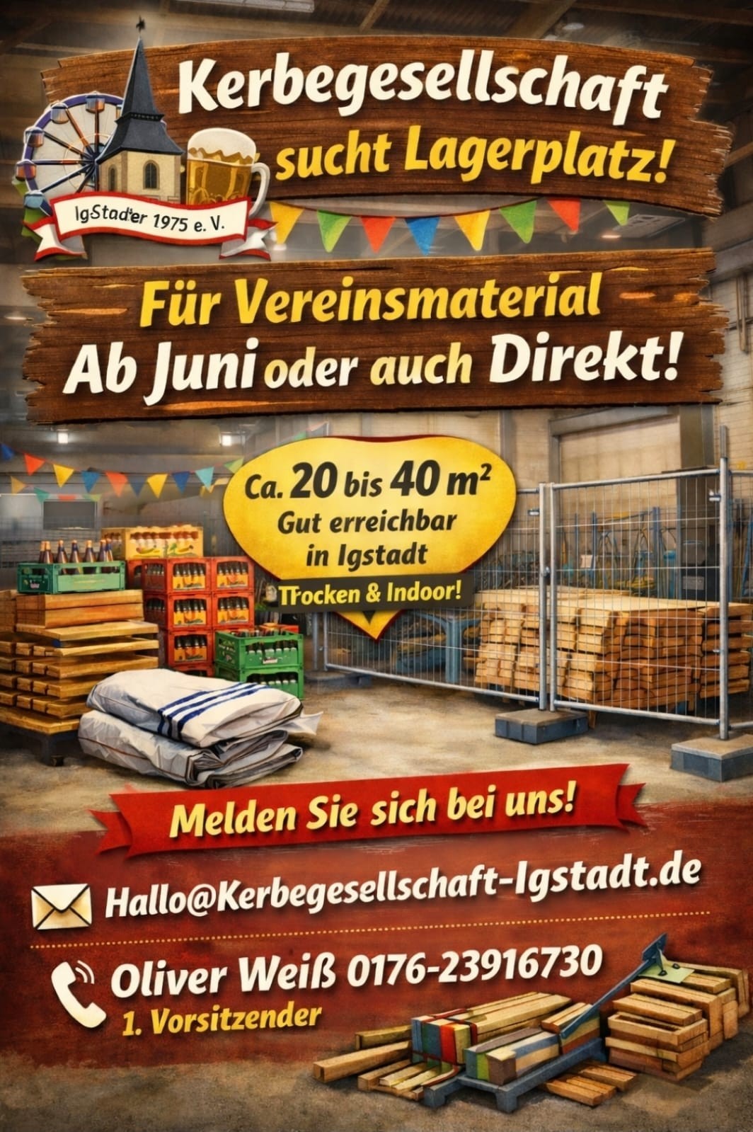 Die Kerbegesellschaft Igstadt 1975 e. V. sucht einen neuen Lagerraum für ihr Vereinsmaterial. Benötigt werden ca. 20 bis 40 Quadratmeter, trocken und gut erreichbar in Igstadt – ab Juni oder auch sofort.
