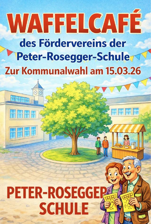 Zur Kommunalwahl am 15. März 2026 lädt der Förderverein der Peter-Rosegger-Schule herzlich zum Waffelcafé ein. In gemütlicher Atmosphäre werden frisch gebackene Waffeln und Kaffee angeboten – eine schöne Gelegenheit, nach dem Gang zur Wahlurne noch einen Moment auf dem Platz an der Linde zu verweilen.