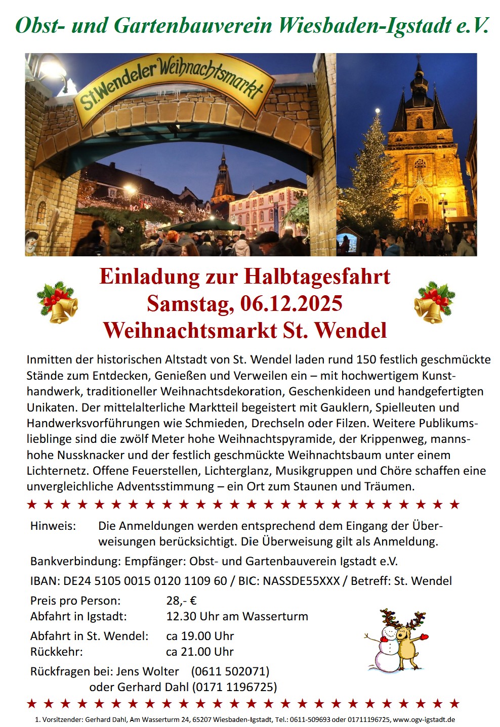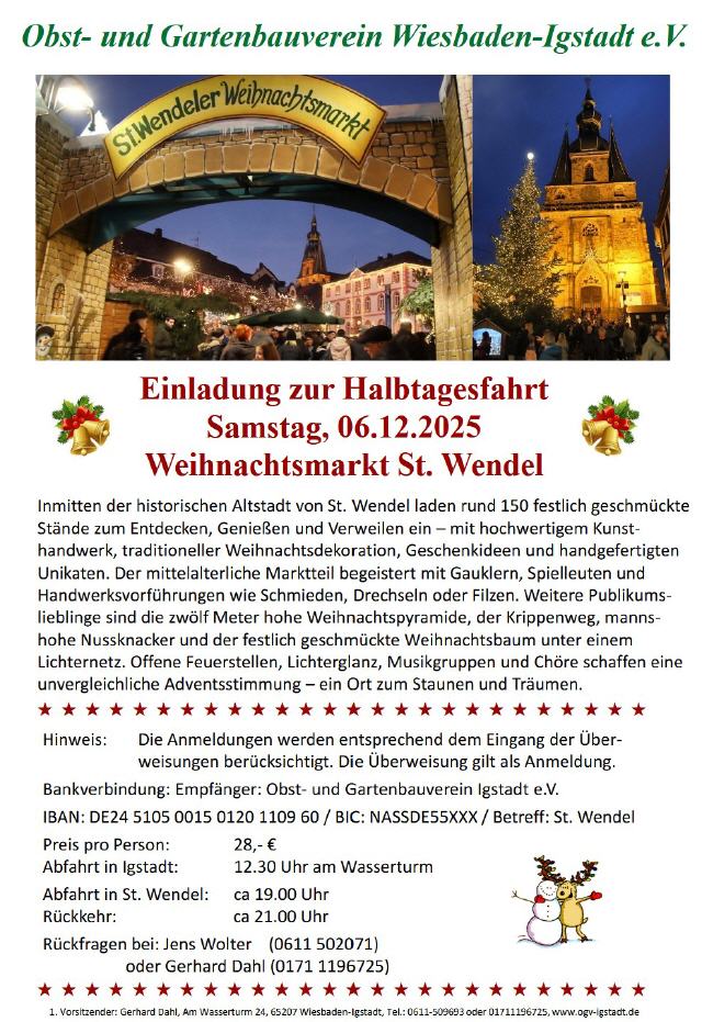 Der Obst- und Gartenbauverein Wiesbaden-Igstadt lädt am Samstag, 6. Dezember 2025, zu einer stimmungsvollen Halbtagesfahrt zum Weihnachtsmarkt in St. Wendel ein.